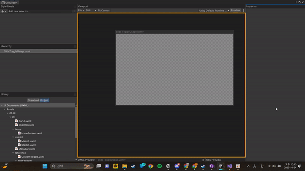 이제 아까 만들었던 UIDocument를 실행하고 아까 만들었던 Style Sheet를 추가해준 뒤 Project > Custom Controls > MyUILibrary에 있는 SliderTogle을 가져온다.