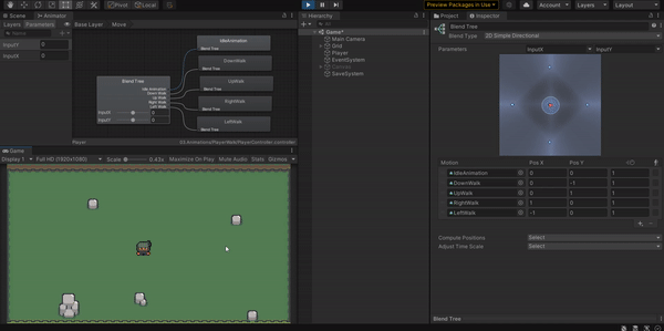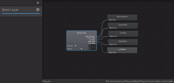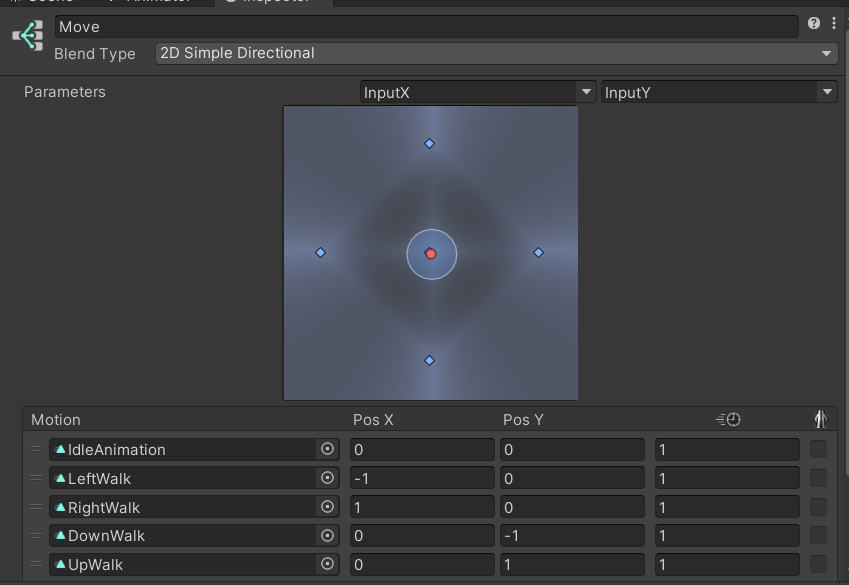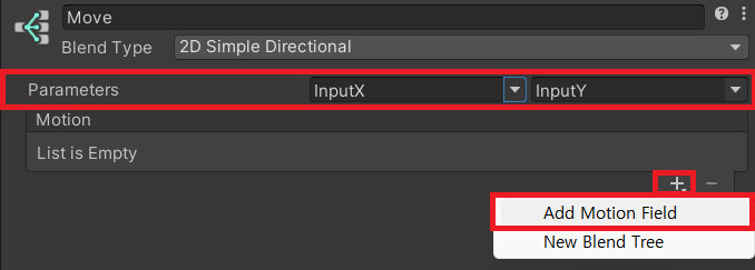 모션필드에 x값과 y값을 설정해 주고 그 값에 맞는 애니메이션을 추가해 준다.