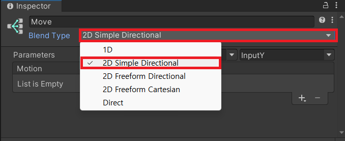 인스펙터 창에서 블렌드 타입을 2D Simple Directional로 변경해 준다.