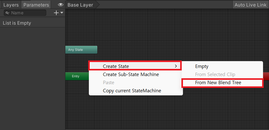 먼저 애니메이터에서 오른쪽마우스 클릭 > Create State > From New Blend Tree